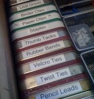 Alla har vi en sån där låda som allt smått hamnar i; pennor, sudd, gem, skruvar, etc. etc. etc.... Varför inte ta tag i den lådan och sortera allt i små askar med namn på? Ta lådan och slå dig ner framför TVn eller radion vet ja, och börja sortera.